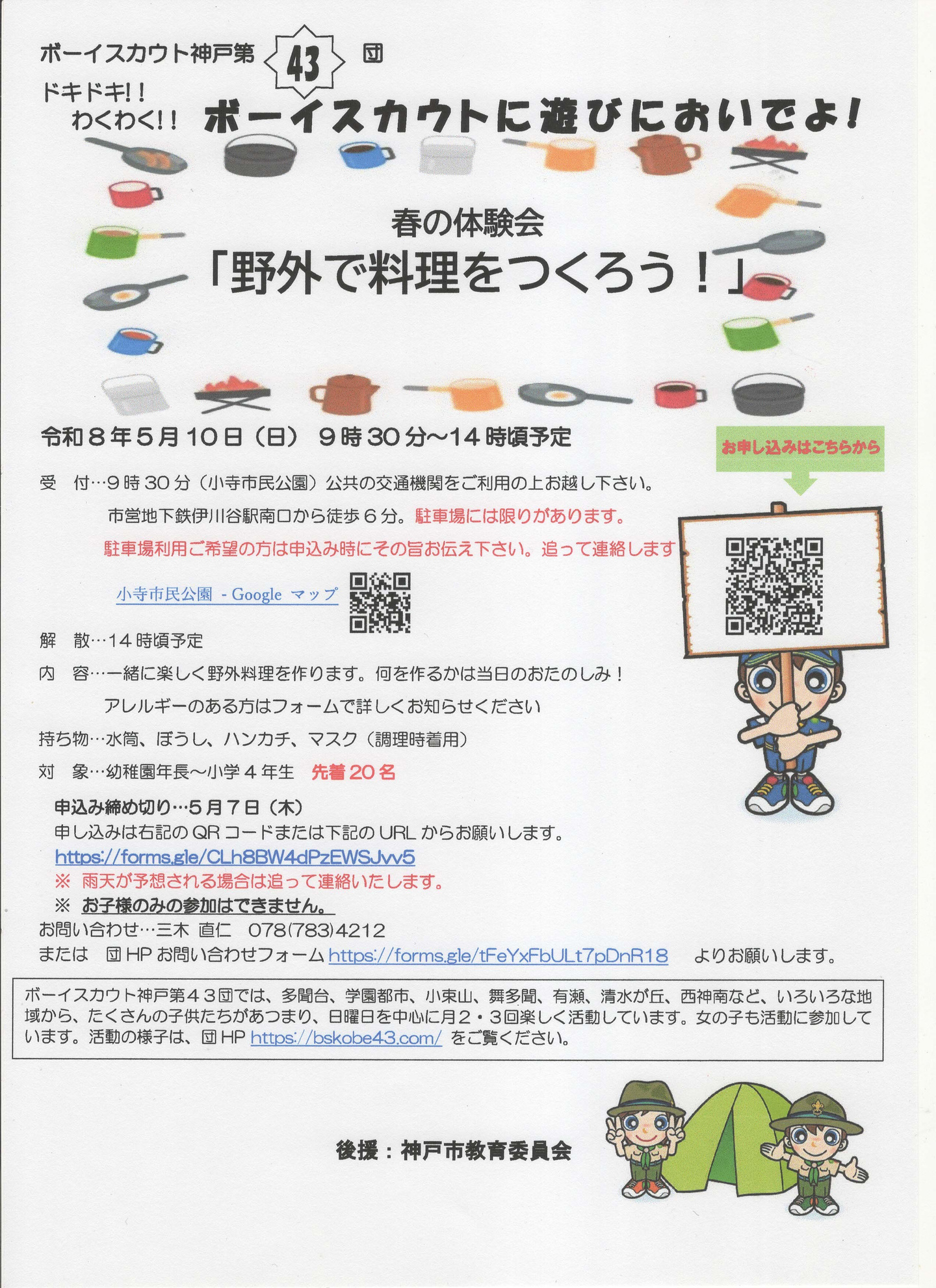 持ち物: 水筒、ぼうし、ハンカチ、マスク(料理時着用)