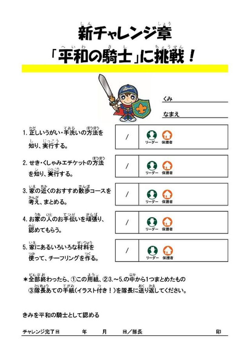 活動自粛の3ヶ月間は本当に長かったですが、自粛中のこころみとして「新チャレンジ章『平和の騎士に挑戦!』という活動や、オリジナル物語作り、写真コンテストなど、たくさんの楽しい活動ができました。