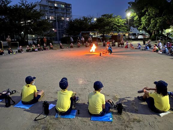 一年の締めくくりの「お別れ団営火」を行いました。 団の活動へ ビーバースカウトからローバースカウトまで、スタンツやゲームなど様々な出し物をして、43団関係者全員で楽しみました。 最後に副団委員長のお話を聞きながら、ファイヤーを囲み、みんなで今年一年を振り返りました。 ウイルスによる活動自粛期間など、苦しいこともありましたが、その中でスカウトとして何が出来るか考えて実行できたこともあったと思います。 この経験を糧に、9月からの新しい年度も楽しく、さらに成長してもらいたいと思います。 ▲ ページトップへ